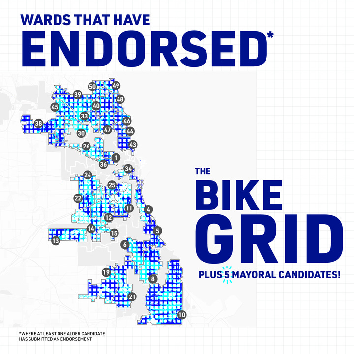 It’s amazing what a bunch of organized people can accomplish. It really is. Check out the endorsement page to see. 5 Mayoral candidates have endorsed the Grid and a whole bunch of alder candidates too. This is the time to get out and support candidates that have endorsed the bike grid, especially those facing less bike-friendly opponents. There are at least three alder races that where a Bike Grid endorsing candidate is competing with at least one unsupportive candidate. Their campaigns need boots on ground for phone banking, but you can also do your own promoting on social media and by personally reaching out to people you know in those wards to let them know why their vote matters. Three wards in particular— 11th Ward (Ambria Taylor), 39th Ward (Denali Dasgupta), 45th Ward (Susanna Ernst and James Suh) — have important races.